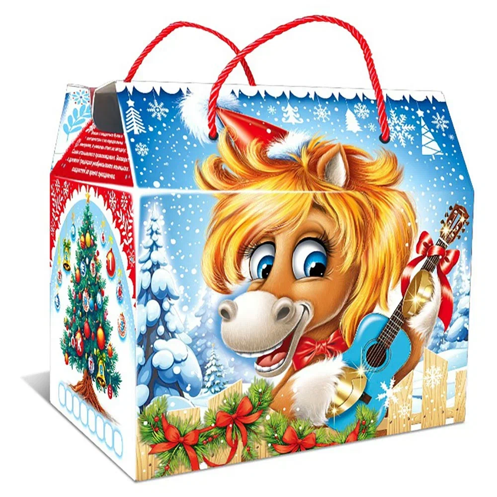Новогодняя коробка украшена веселой лошадкой в новогодней шапке, держащей гитару на фоне снежного пейзажа и рождественской елки.