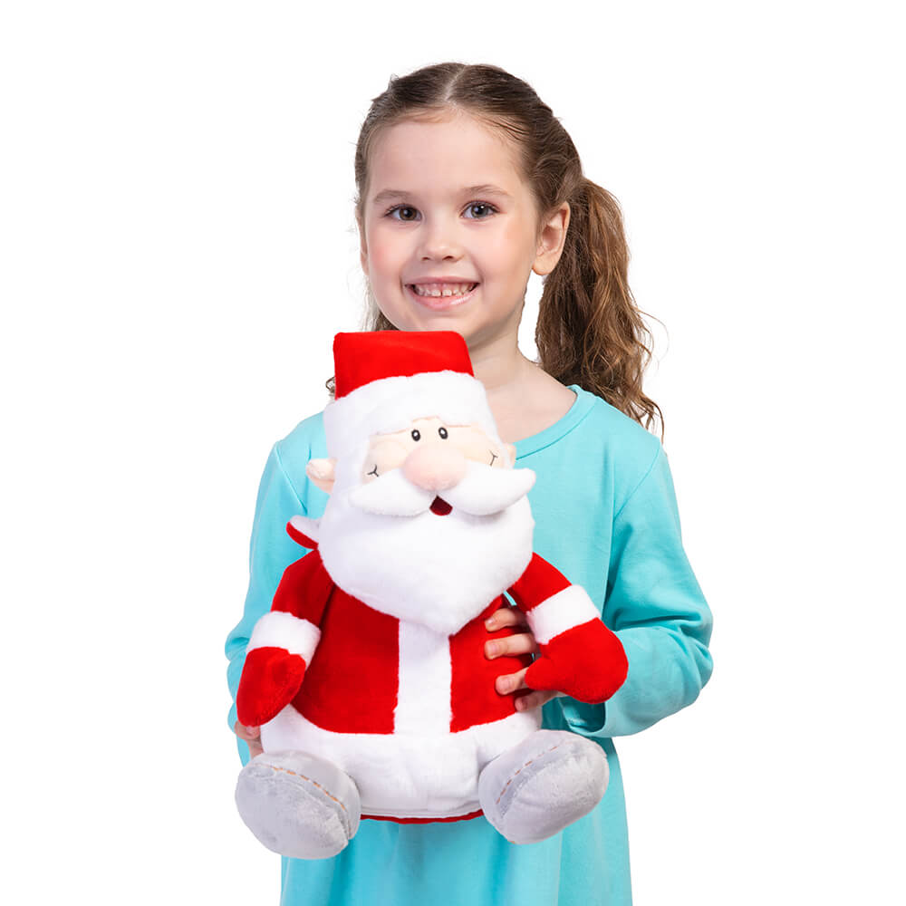 Широко улыбающийся Дедушка Мороз с густой бородой, в классическом костюме с отделкой из белоснежного меха — красный кафтан с воротником, шапочка с помпоном, варежки и валенки. Глаза и улыбка сделаны вышивкой.