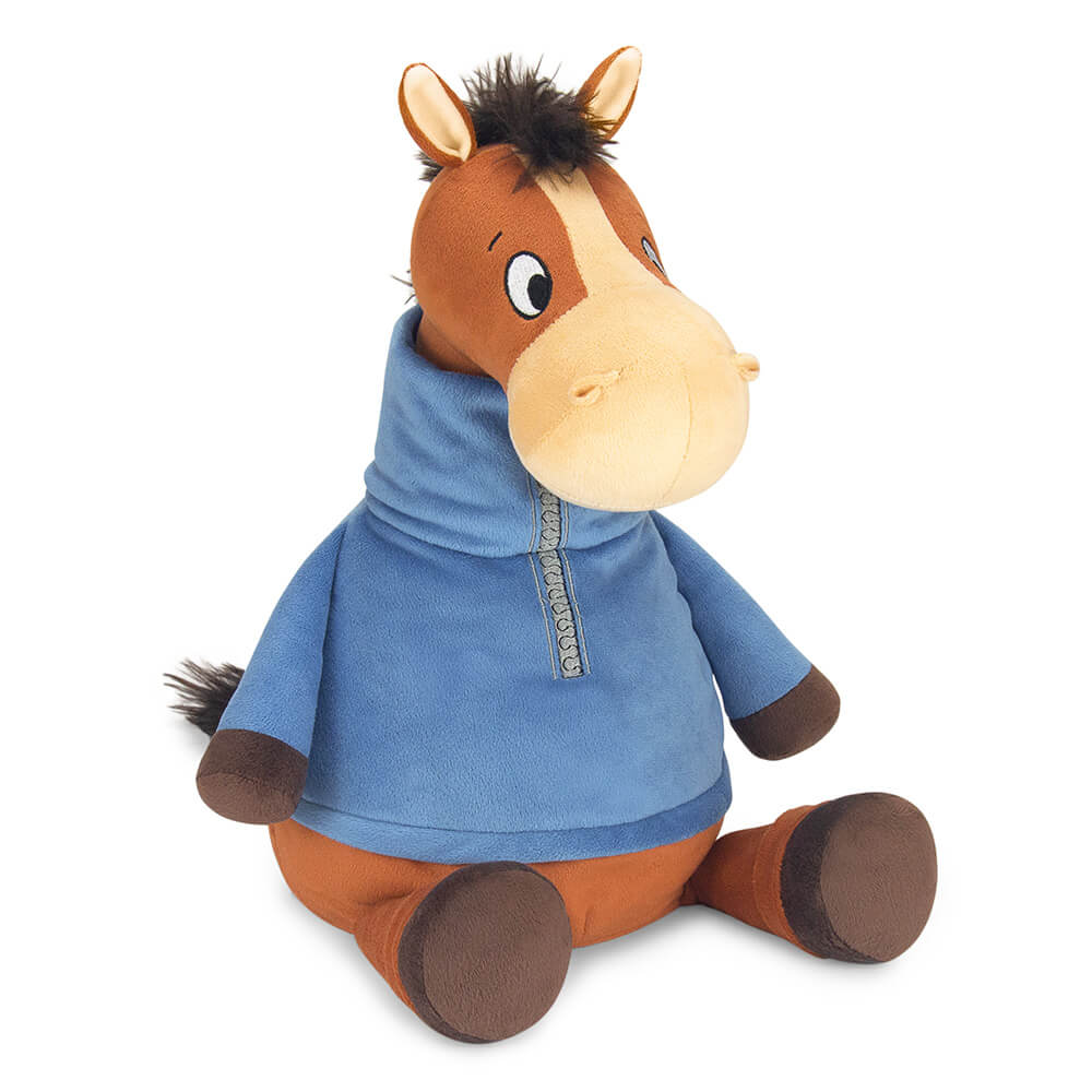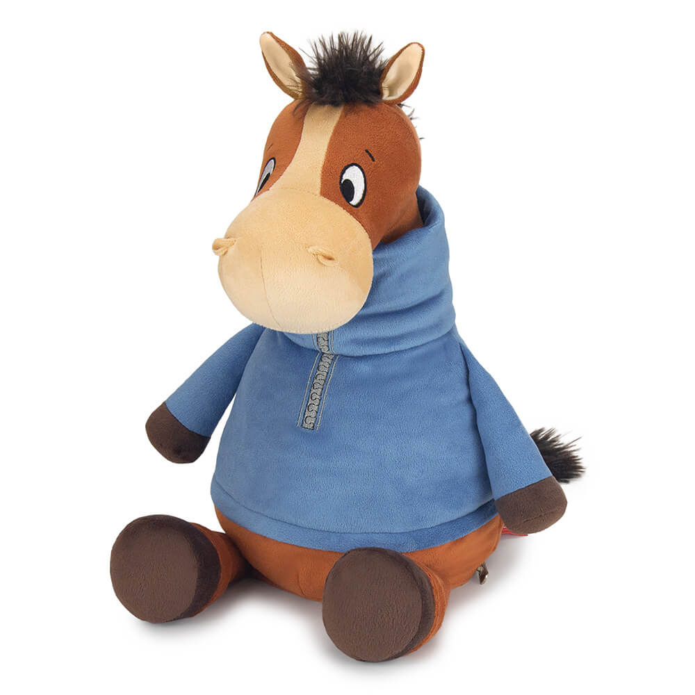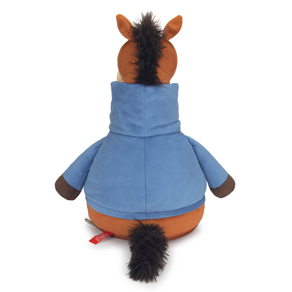 Новогодний подарок конь Тим сшит из мягкого софта. У него нежная синяя кофточка, которая согревает в любую погоду. Внутри мягкой игрушки потайной карман на молнии со сладким подарком. Набор конфет 600г Стандарт.