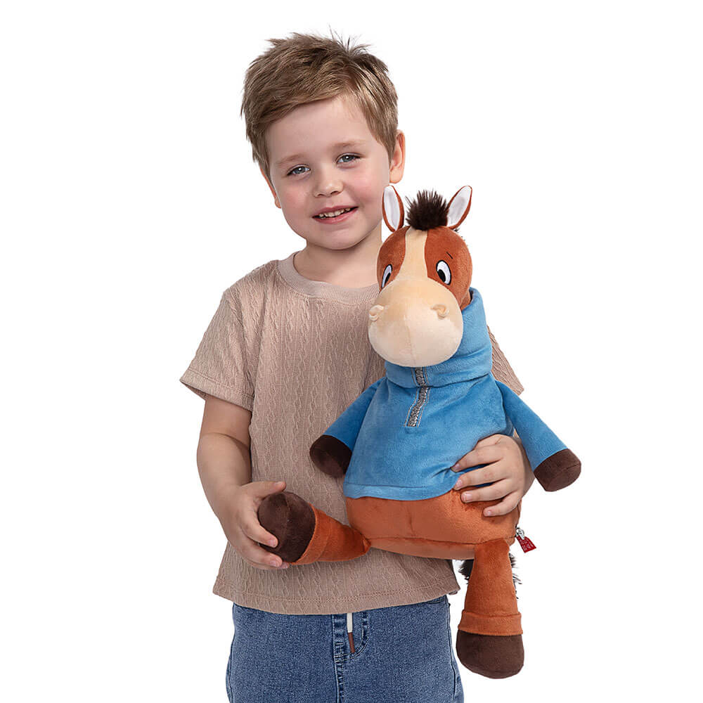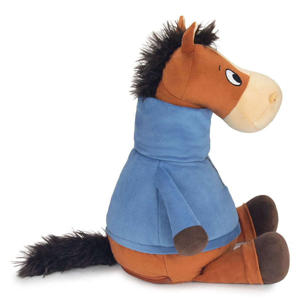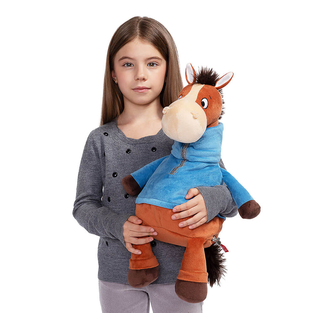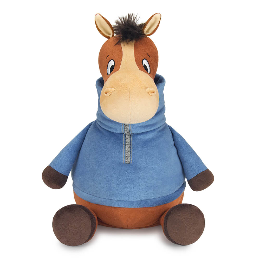 Новогодний подарок конь Тим сшит из мягкого софта. У него нежная синяя кофточка, которая согревает в любую погоду. Внутри мягкой игрушки потайной карман на молнии со сладким подарком. Набор конфет 600г Стандарт.